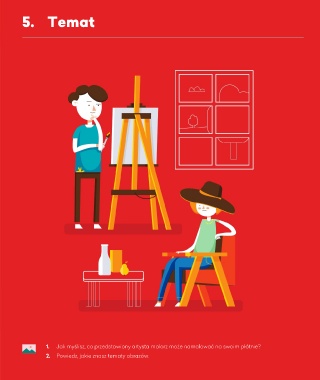 5. temat 1. Jak myślisz, co przedstawiony artysta malarz może namalować na swoim płótnie? 2. Powiedz, jakie znasz tematy obrazów.