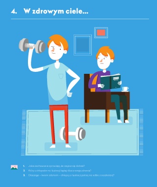 4. W zdrowym ciele... 1. Jakie zachowania sprawiają, że czujesz się dobrze? 2. Który z chłopców na ilustracji lepiej dba o swoje zdrowie? 3. Dlaczego – twoim zdaniem – chłopcy z ilustracji patrzą na siebie z zazdrością?