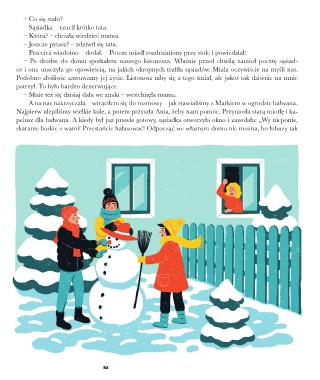 pelusz dla bałwana. A kiedy był już prawie gotowy, sąsiadka otworzyła okno i zawołała: „Wy nicponie,