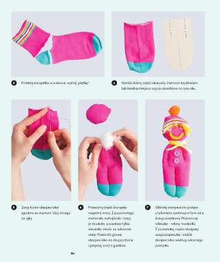 5    Zszyj tułów skarpeciaka         6    Przeszytą część skarpety        7    Główkę skarpeciaka połącz